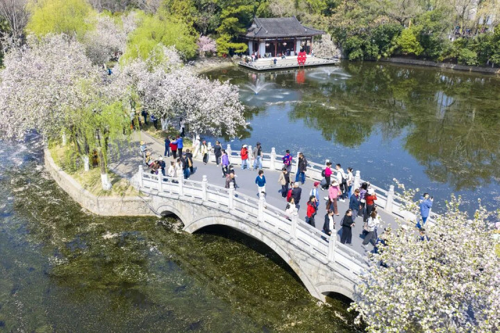 3月29日,搭客在江苏南京莫愁湖公园赏花游玩(无东谈主机像片)。新华社发(史俊摄)