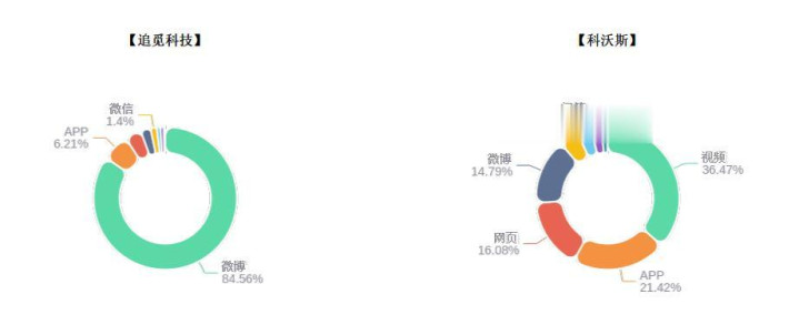 在分析时刻段内,“追觅科技”决策的主要传播平台齐集在微博661592条(占比84.56%);“科沃斯”决策的主要传播平台齐集在视频120547条(占比 36.47%)。