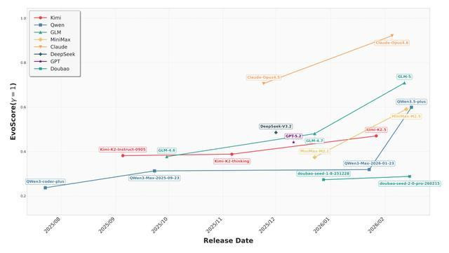 在所有参评大模子中,ClaudeOpus系列弘扬最为凸起,从Claude-opus-4.5到Claude-opus-4.6,金年会官网首页入口其EvoScore跃升至约0.9的高位,明显拉开了与所有竞争敌手的差距。