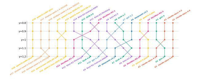 跟着权重参数γ的变化,各个大模子的排行也随之发生权贵调理。当γ>1时,大模子排行越高,其代码库调节才调越强。图片