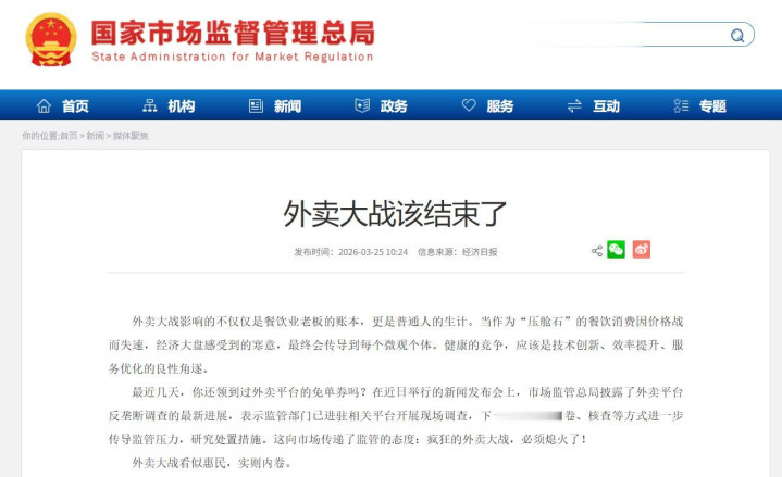 在好意思团发家报的前一日,3月25日,一个有点神秘的本事点,国度市集监管总局官网转载了《经济日报》的批驳著作《外卖大战该终显现》。